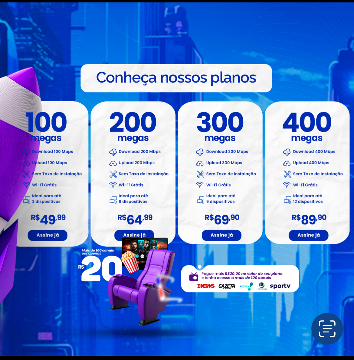 Nossa internet é 100% Fibra Óptica com valor fixo na fatura. Com Tecnologia de última geração para você e sua família aproveitar o melhor dos jogos, filmes em alta resolução, redes sociais e outros recursos da internet.